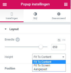 Afhankelijk van wat voor popup je wilt maken, kun je de breedte van de popup hier aanpassen. Om de hoogte in te stellen van de popup heb je drie verschillende opties: