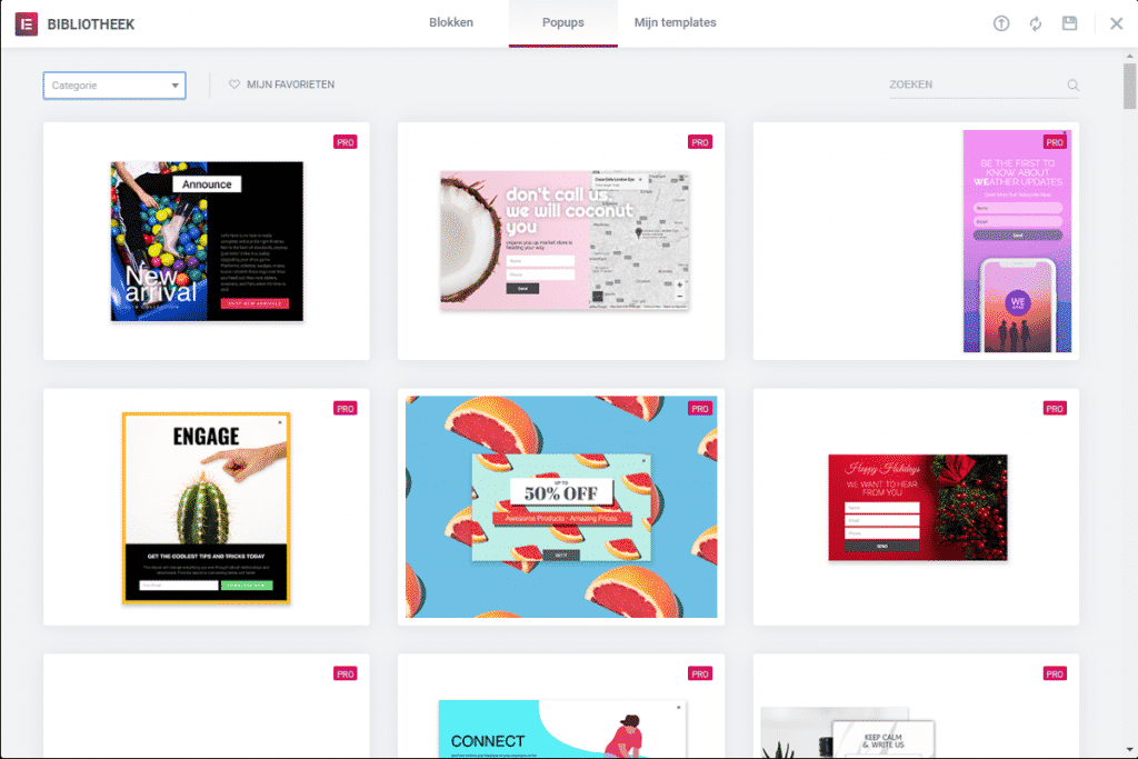 Wanneer je voor het eerst werkt met popups maken in WordPress met Elementor Pro, is het handig om te beginnen met een popup template uit de Elementor bibliotheek. Hier heb je ruime keuze uit verschillende popups.