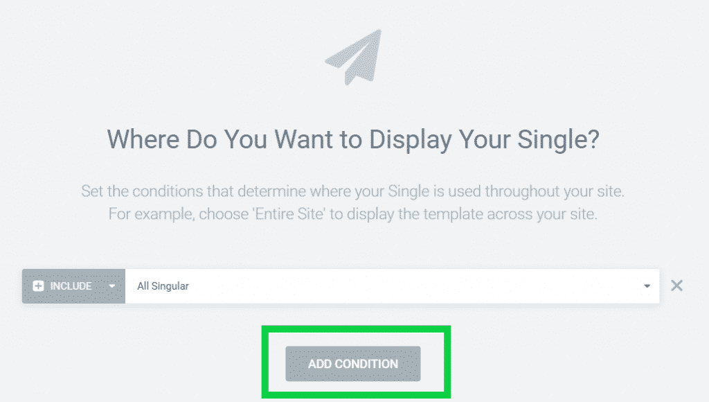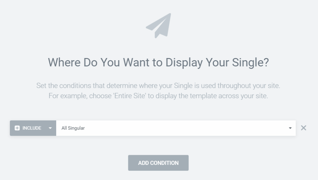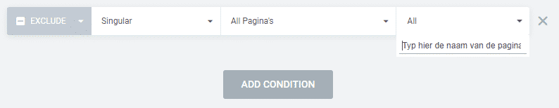 Je kunt er ook voor kiezen om meerdere condities in te stellen voor je template. Als je het template bijvoorbeeld voor een specifieke pagina wilt uitsluiten of een template wilt gebruiken voor meerdere post types. Dit doe je simpelweg door op ‘Add condition’ te klikken.