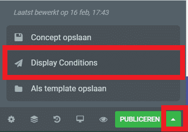 Wanneer je voor het eerst een template publiceert (door onderaan op de ‘publiceren’ knop te klikken), verschijnt er vanzelf een venster waarop je de publicatie condities kunt instellen. Als je al een template hebt gemaakt en je wilt de publicatie condities opnieuw instellen of wijzigen, ga je naar ‘display conditions’. Deze optie vind je als je op het pijltje in de ‘publiceren’ knop klikt.